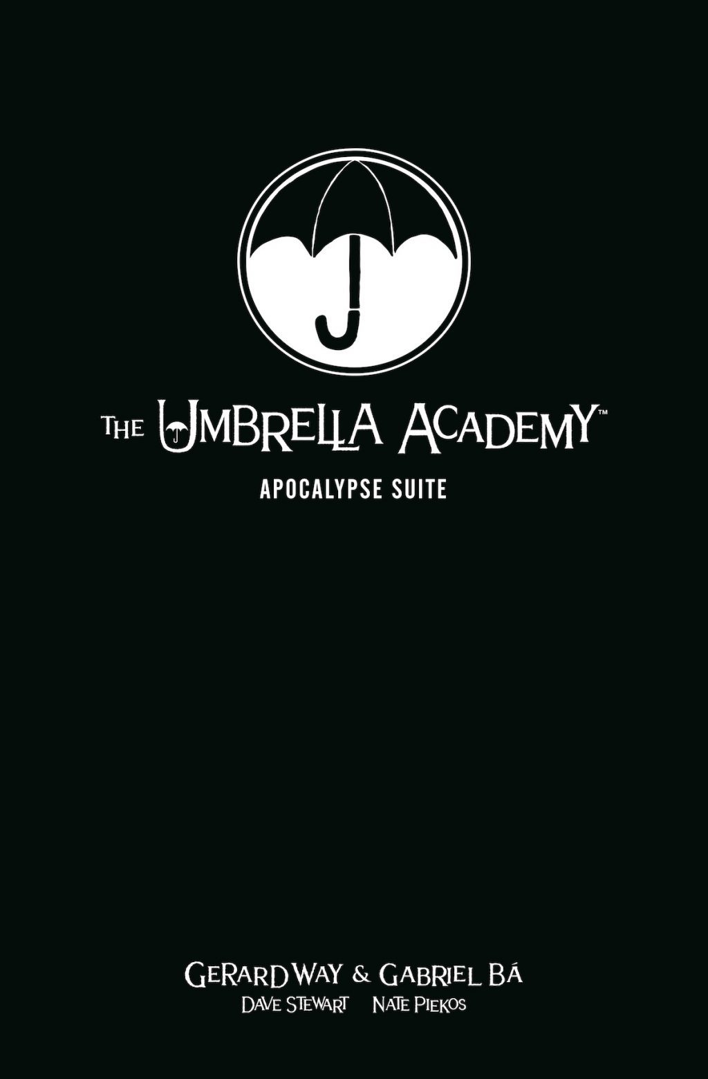The Umbrella Academy: Apocalypse Suite Library Edition collects the 2008 limited edition of the complete first series, Apocalypse Suite, with the short stories “Mon Dieu!” and “But the Past Ain’t Through with You,” as well as an expanded 50-page sketchbook section.
