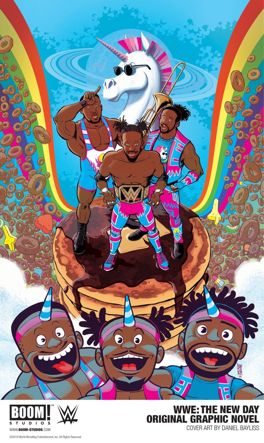 WWE: THE NEW DAY graphic novel, featuring a cover by Daniel Bayliss (Jim Henson’s The Labyrinth), is the latest release from BOOM! Studios’ eponymous imprint, home to other WWE comic books and graphic novels, such as WWE: Undertaker by writer Chad Dundas and artists Rodrigo Lorenzo, Edu Menna, Serg Acuña, Kelly Williams, Travis Hymel & Tim Lattie, and Kendall Goode; WWE Vol. 1-6 by writers Dennis Hopeless, Samoa Joe & Michael Kingston, Julian May, Arune Singh, and Lan Pitts and artists Serg Acuña, Kendall Goode, Daniel Bayliss, Rodrigo Lorenzo, and Michael Mulipola; WWE: Then. Now. Forever. Vol. 1-3 which include stories by writers Rob Schamberger, Derek Fridolfs, Box Brown, Ryan Ferrier and artists Dan Mora, Jorge Corona, Kendall Goode, Andy Belanger and more; and WWE: NXT Takeover by writer Dennis Hopeless and artists Jake Elphick, Hyeonjin Kim, Kendall Goode, and Rodrigo Lorenzo.