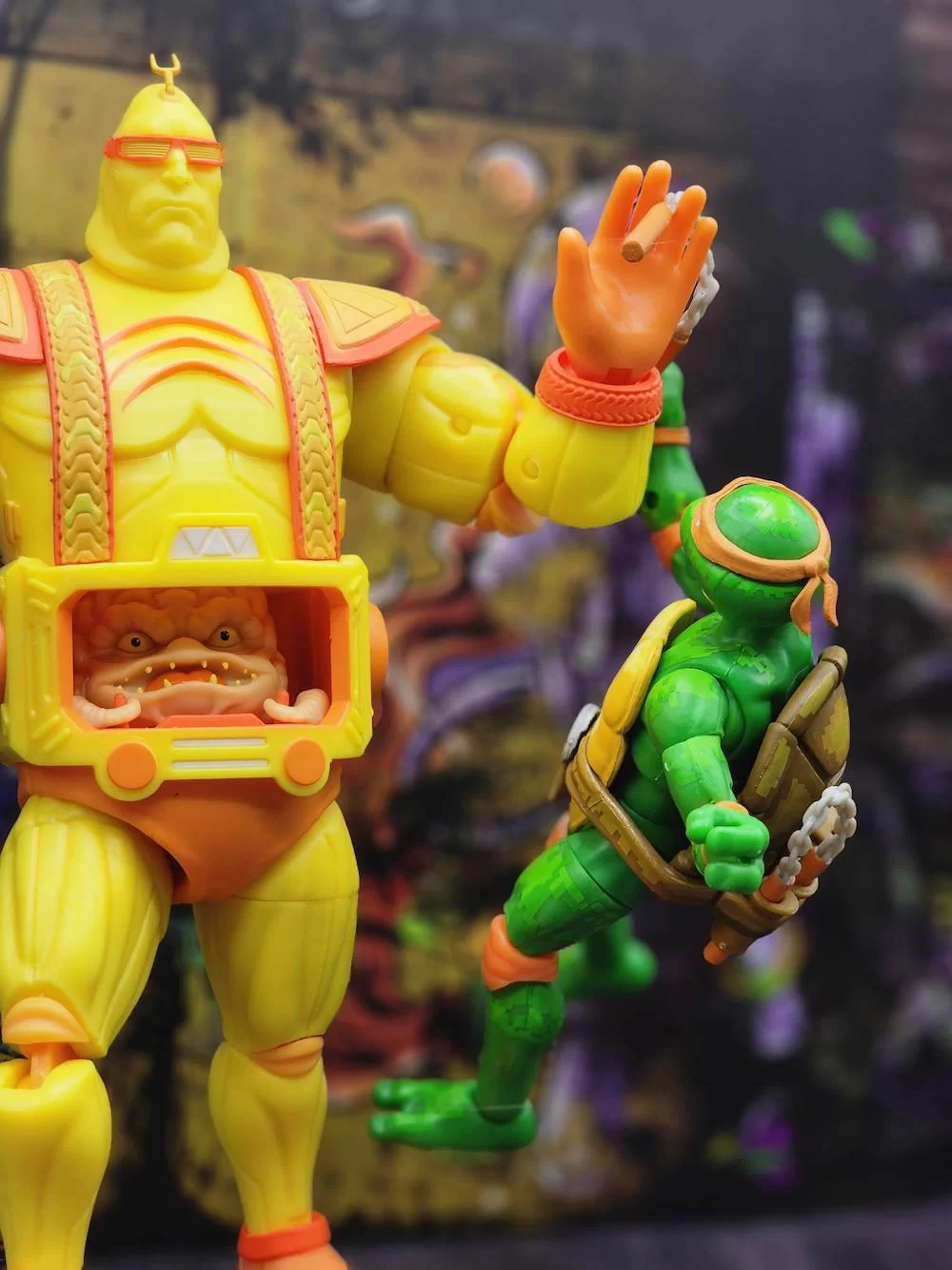 The latest addition to the BST AXN line of 1/15th scale figures from The Loyal Subjects is the Krang Arcade Damage Android action figure, standing at an impressive 8 inches tall. This action figure features a striking yellow and orange paint scheme that perfectly matches the colors of the classic arcade game Teenage Mutant Ninja Turtles.