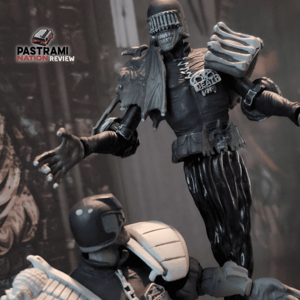 These 1/18th scale figures come packaged on a traditional bubble package and come loaded with two bases, base connectors, extra hands, and a baton and lawgiver gun for Judge Dredd. Judge Death’s bottom half is bendy so that you can wrap him around Dredd for some excellent posing options. Judge Death’s upper half and Dredd both sport some fantastic articulation. The massive pauldrons on both left sides of the figures are removable in case you were wondering about articulation there. The sculpting is excellent- such detail in these unique black and white versions. I love the sculpting, and simplistic painting apps goes a long way here.