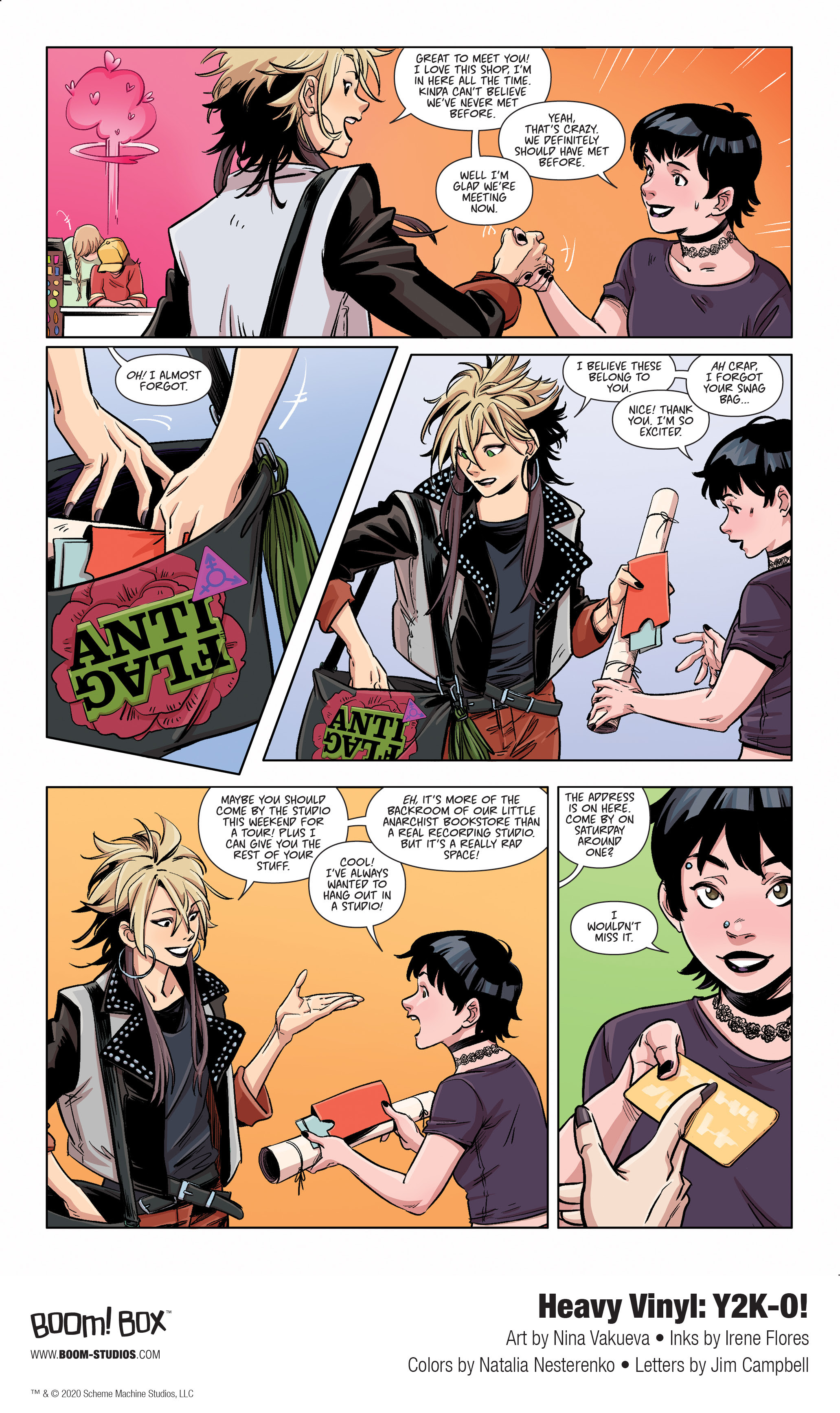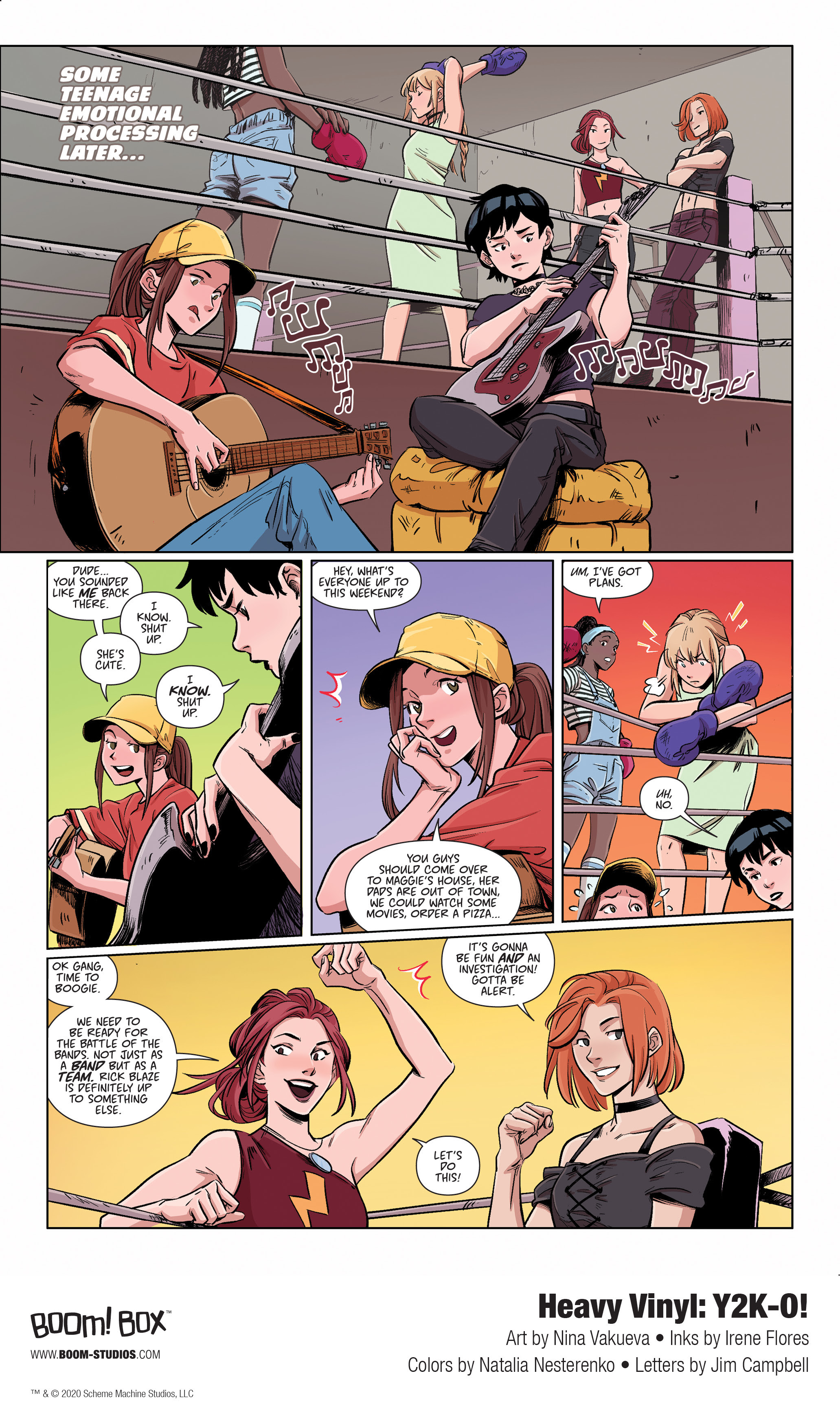 Print copies of HEAVY VINYL: Y2K-O! will be available on March 25, 2020 at local comic book shops (use comicshoplocator.com to find the nearest one), March 31, 2020 at bookstores, or at the BOOM! Studios webstore. Digital copies can be purchased from content providers, including comiXology, iBooks, Google Play, and the Madefire.