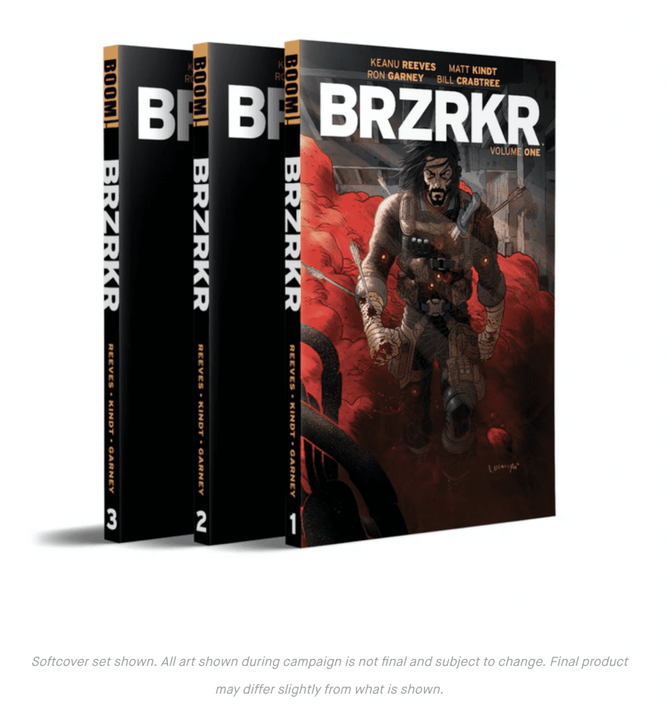 As part of a campaign to bring new readers to comics BOOM! Studios announced that BRZRKR, the blockbuster new series from the iconic Keanu Reeves alongside New York Times bestselling co-writer Matt Kindt (Folklords, Bang!), superstar artist Ron Garney (Wolverine, Captain America), colorist Bill Crabtree (BPRD), and letterer Clem Robins (Hellboy), will be offered in complete graphic novel sets through Kickstarter. The full campaign can be found here at Kickstarter.
