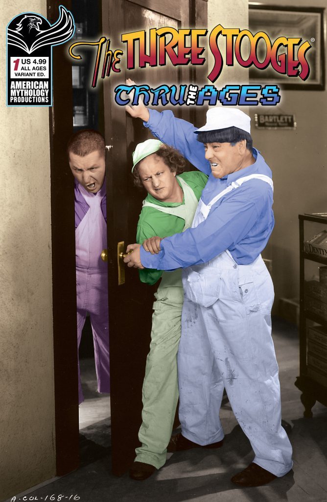 Looking to get in touch with your inner-wiseguy? Trying to put the wit back in your half-wit? Ignite you ignoramus? Well then, American Mythology has just the comic for you! To kick off the book publisher’s five-year anniversary, the company is releasing The Three Stooges, “Thru the Ages”. The book is filled with new Stooge content from front cover to back to help celebrate five years of producing new Three Stooges funny books. It’s a Stoogetacular celebration!
