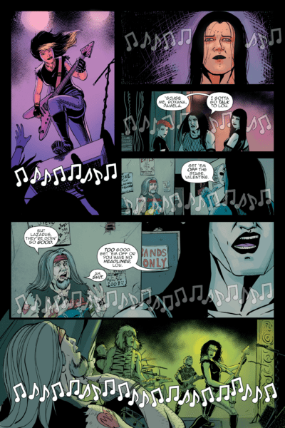 Artist Don Cardenas added, “While drawing epic guitars and gruesome vampires is a blast, what Steve and I care about most are the characters—and the relationships that are forged, strained, or lost when the pursuit of your dreams runs headfirst into a legacy you can’t outrun.”
