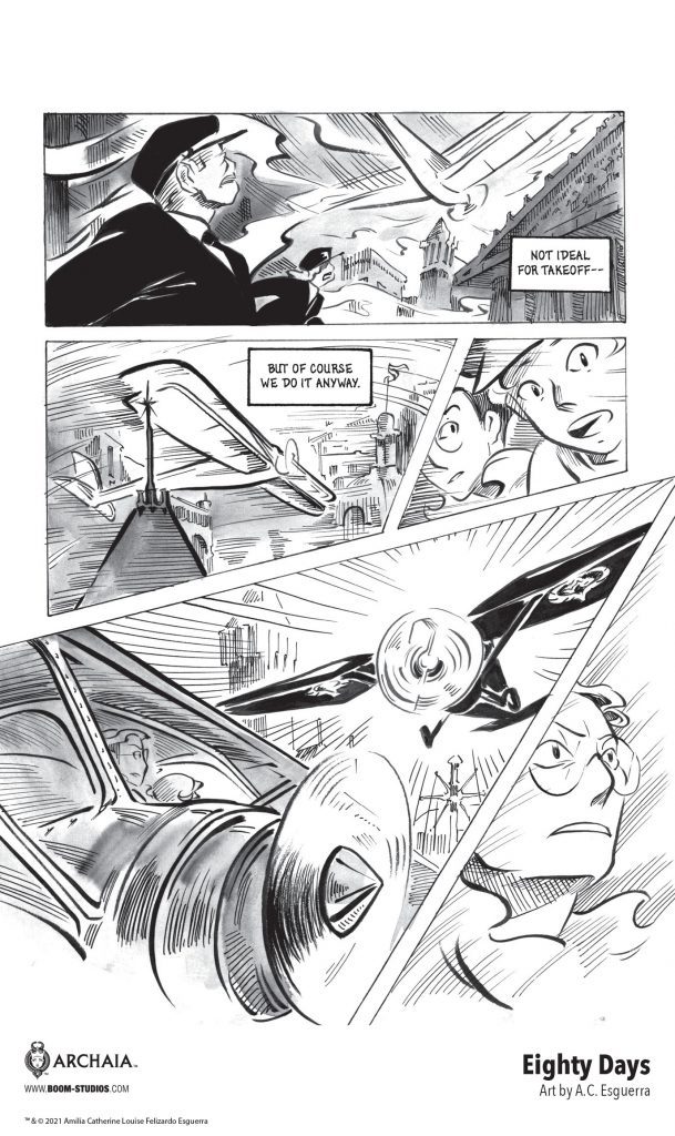Print copies of EIGHTY DAYS will be available for sale on September 1, 2021 at local comic book shops (use comicshoplocator.com to find the nearest one), and on September 7, 2021 at bookstores everywhere or at the BOOM! Studios webstore. Digital copies can be purchased from content providers, including comiXology, iBooks, Google Play, and Kindle.