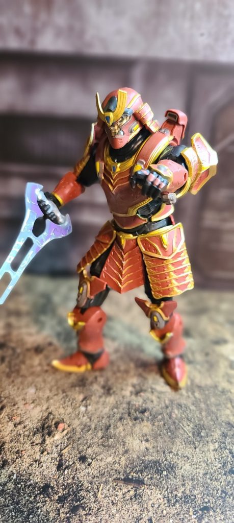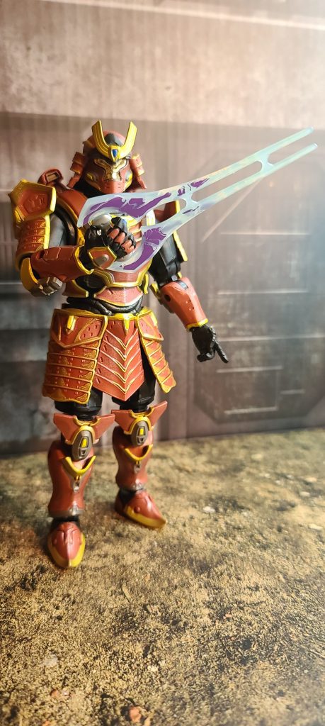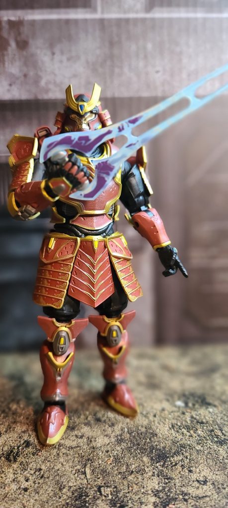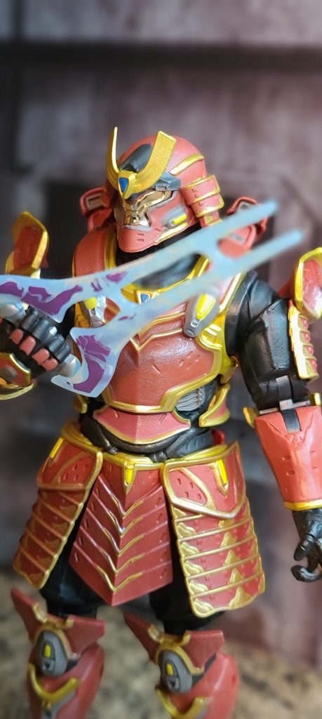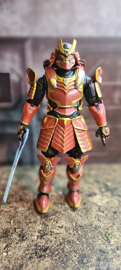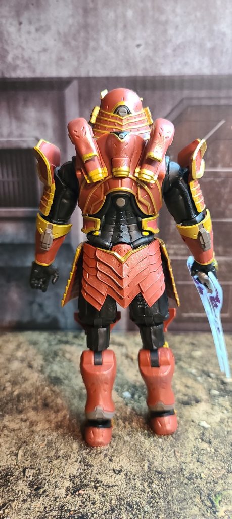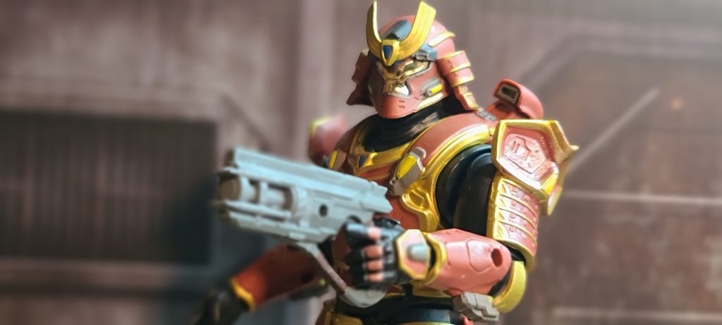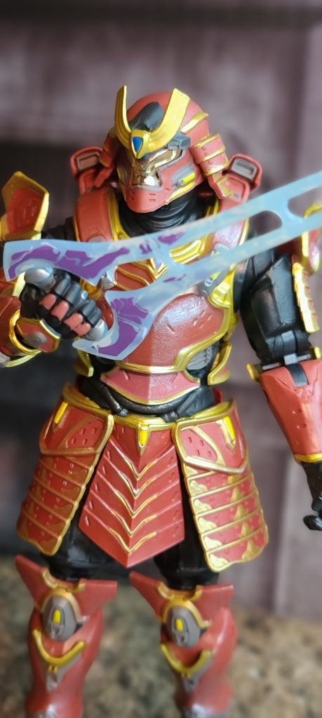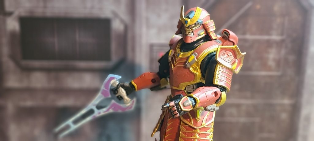 From Jazwares, the figure is part of the Spartan Collection, a 6.5-inch line of figures spanning Halo’s legendary history. This figure comes with an energy sword, disruptor, and extra hand accessories. This is a fantastic figure. It is the first Halo 6.5-inch figure for me, and I had to get it. The samurai-inspired armor works so well for Halo; it’s a great marriage of old town samurais and sci-fi wonderment. I love the quality of feel of this figure- from the amazing paint job to the vac metal visor to the energy sword and gun. The articulation is fantastic, giving a full range of motion for posing.
