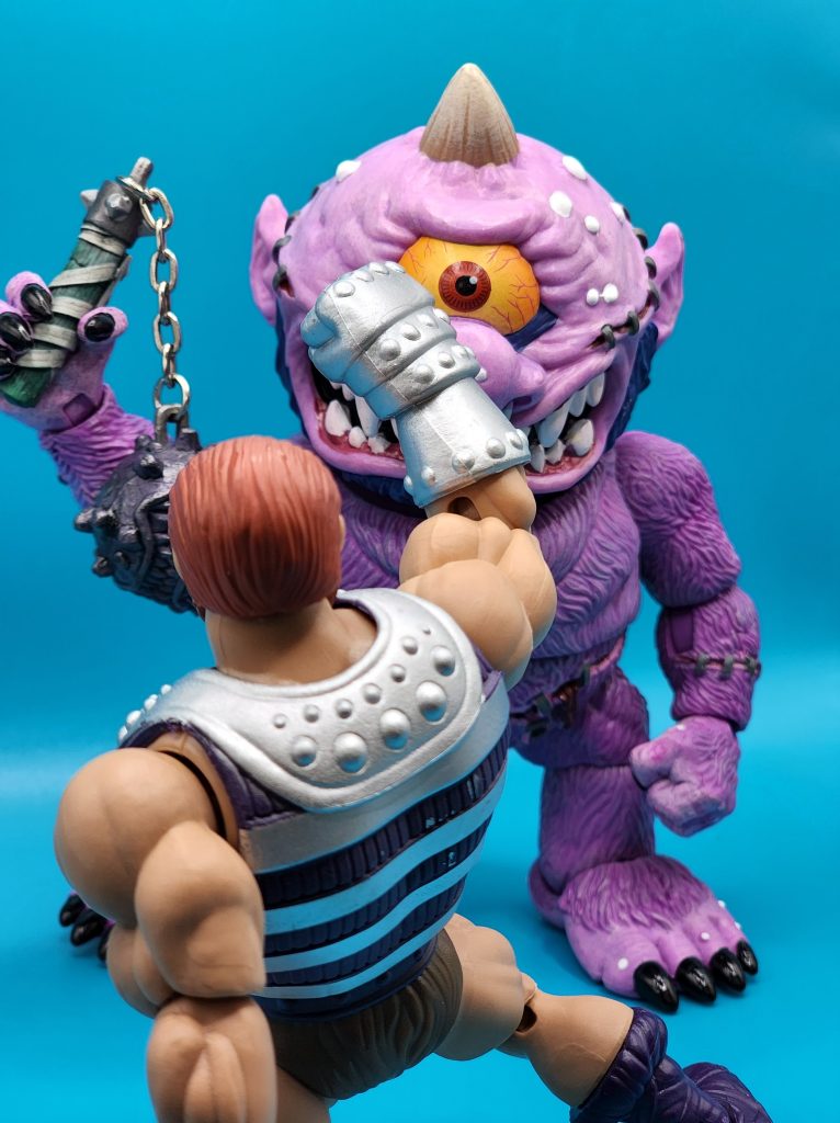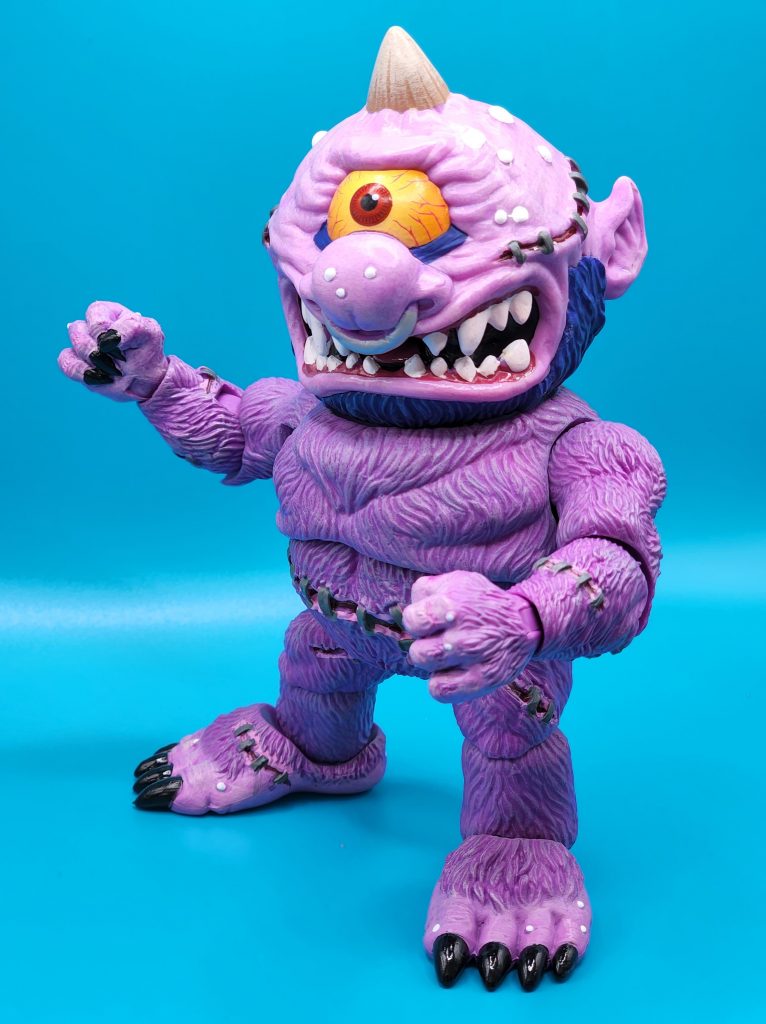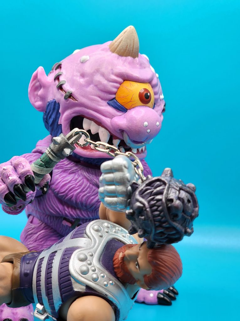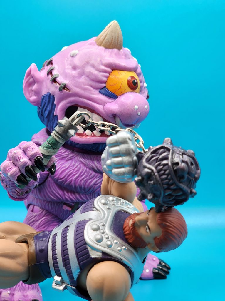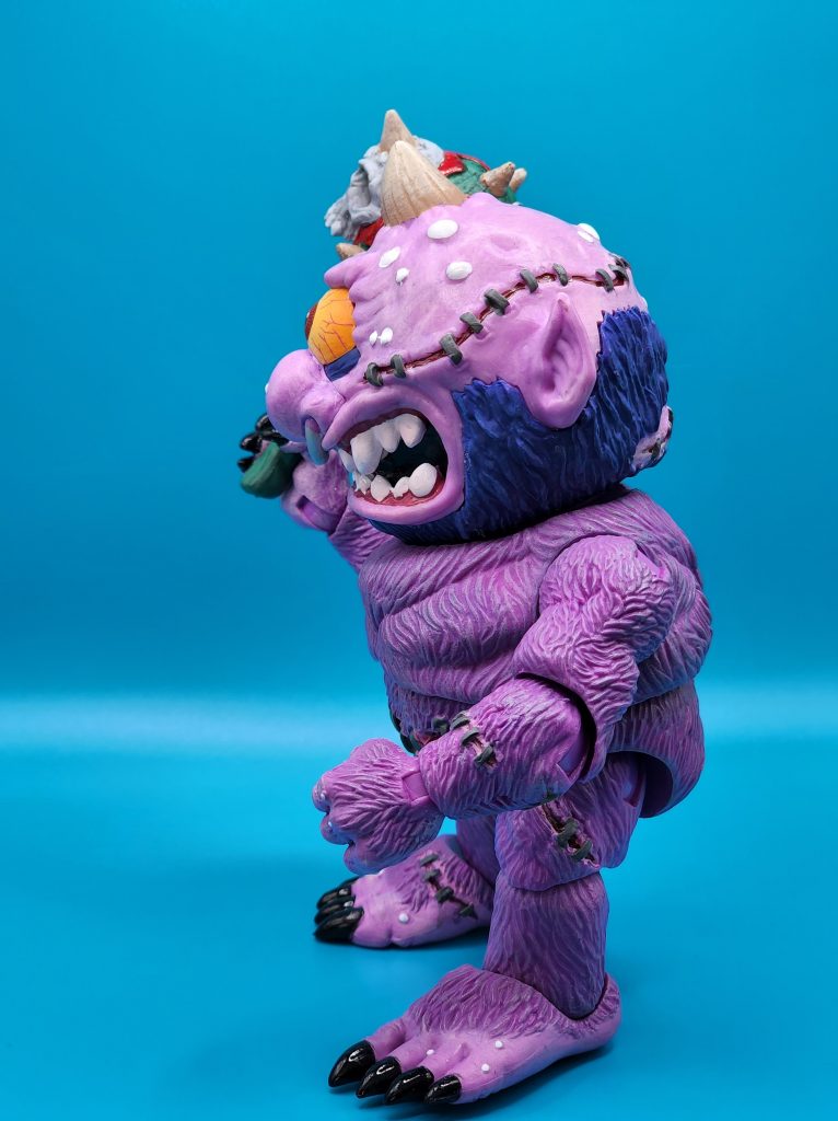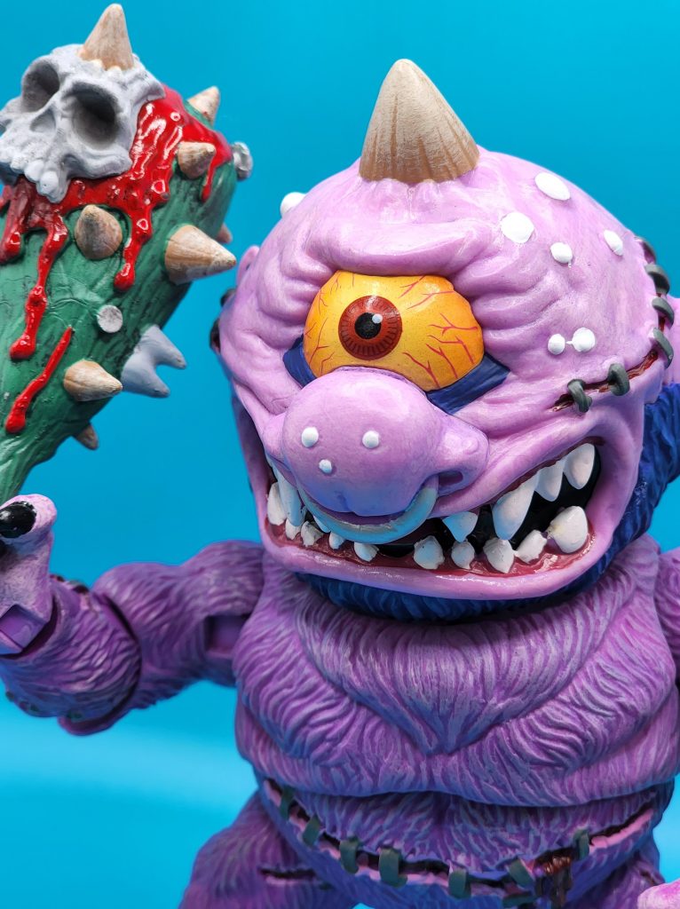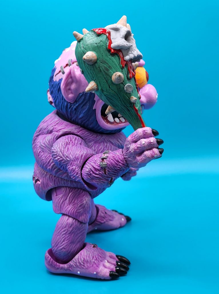 These six-inch figures are exceptionally well done- with 25 points of articulation and easy to snap off and interchangeable limbs with other Madballs figures (MADular technology, as it’s called); these are extremely well thought out, well-executed figures. Horn Head is quite the piece to behold in person: it has a solid weight, yet with joints that can hold the figure upright despite the girth. The figure comes with six extra hands and a turkey leg, club, and mace.