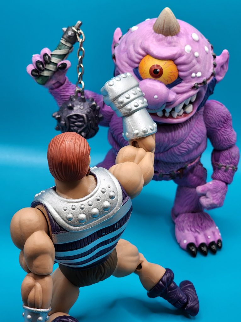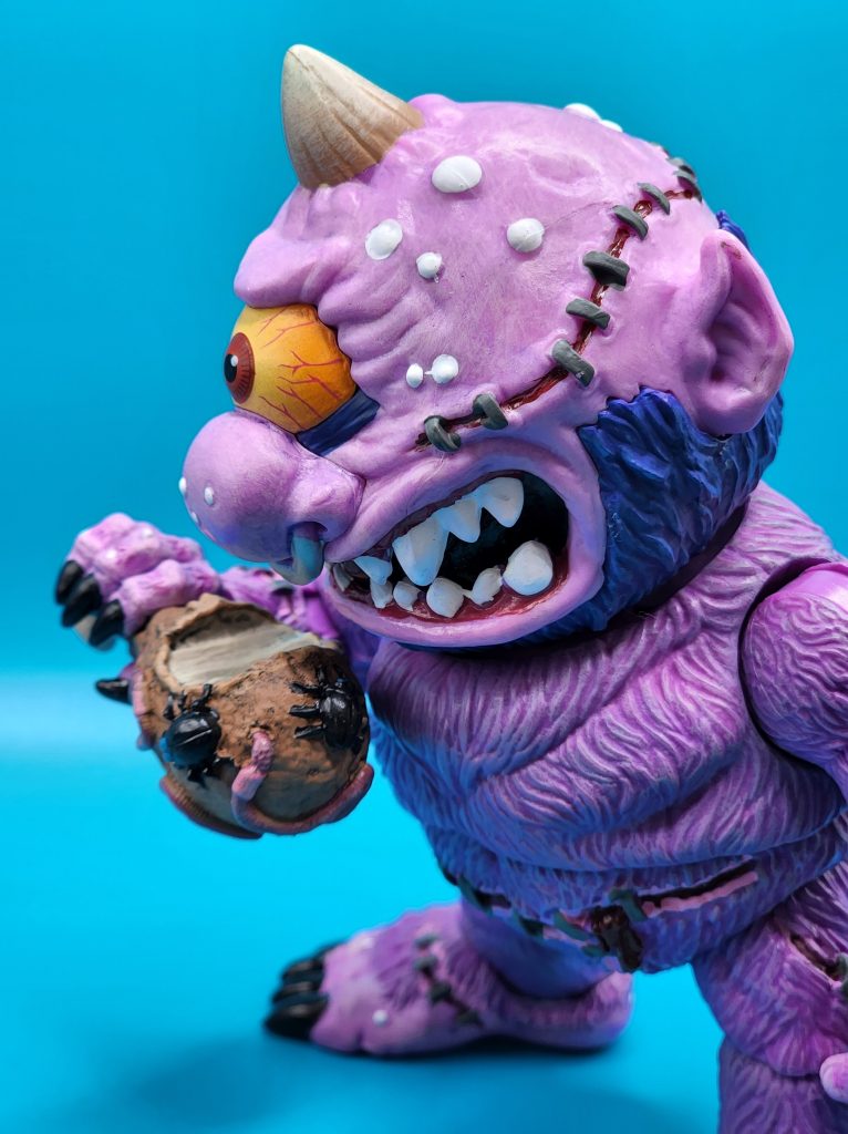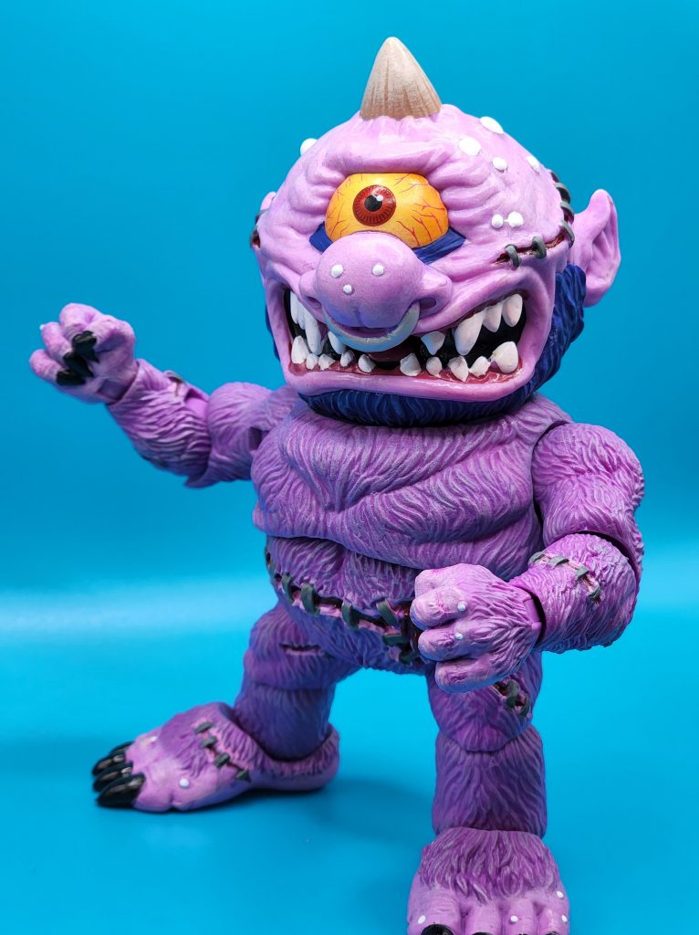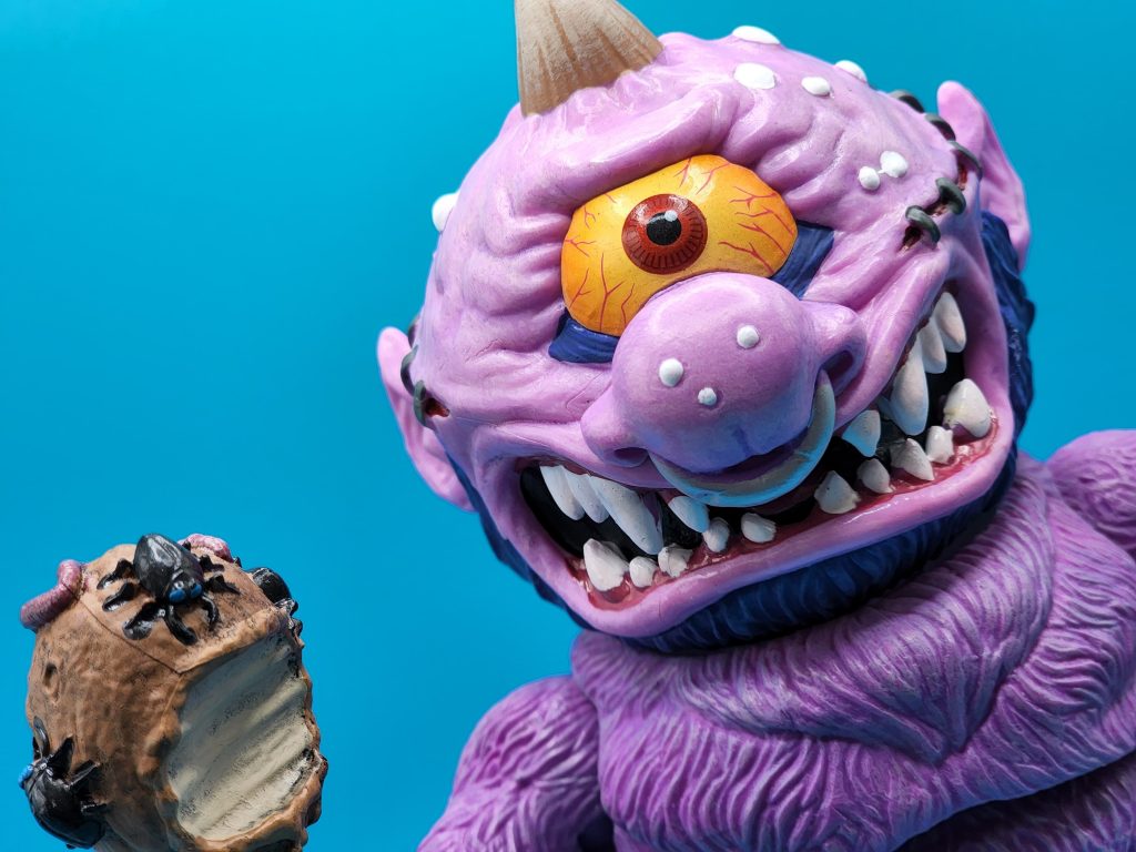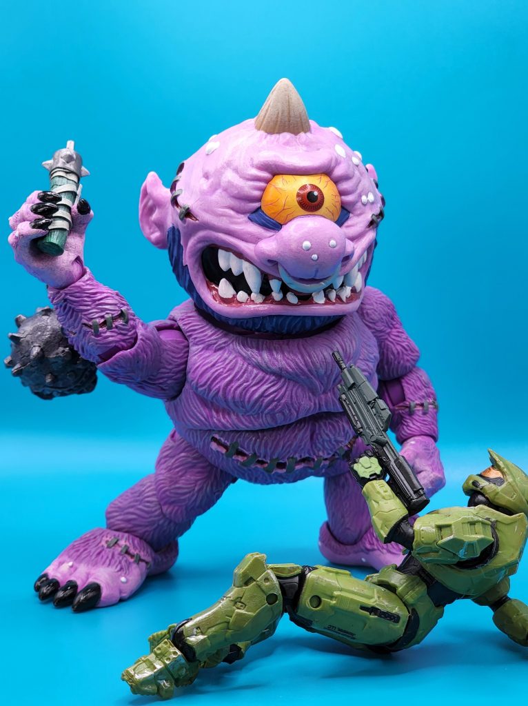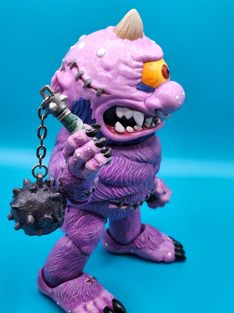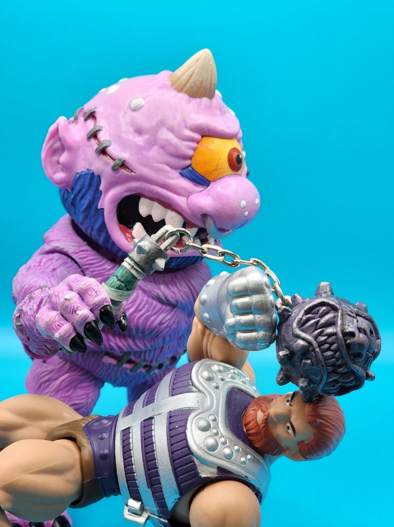 These six-inch figures are exceptionally well done- with 25 points of articulation and easy to snap off and interchangeable limbs with other Madballs figures (MADular technology, as it’s called); these are extremely well thought out, well-executed figures. Horn Head is quite the piece to behold in person: it has a solid weight, yet with joints that can hold the figure upright despite the girth. The figure comes with six extra hands and a turkey leg, club, and mace.