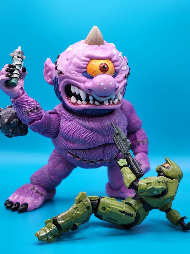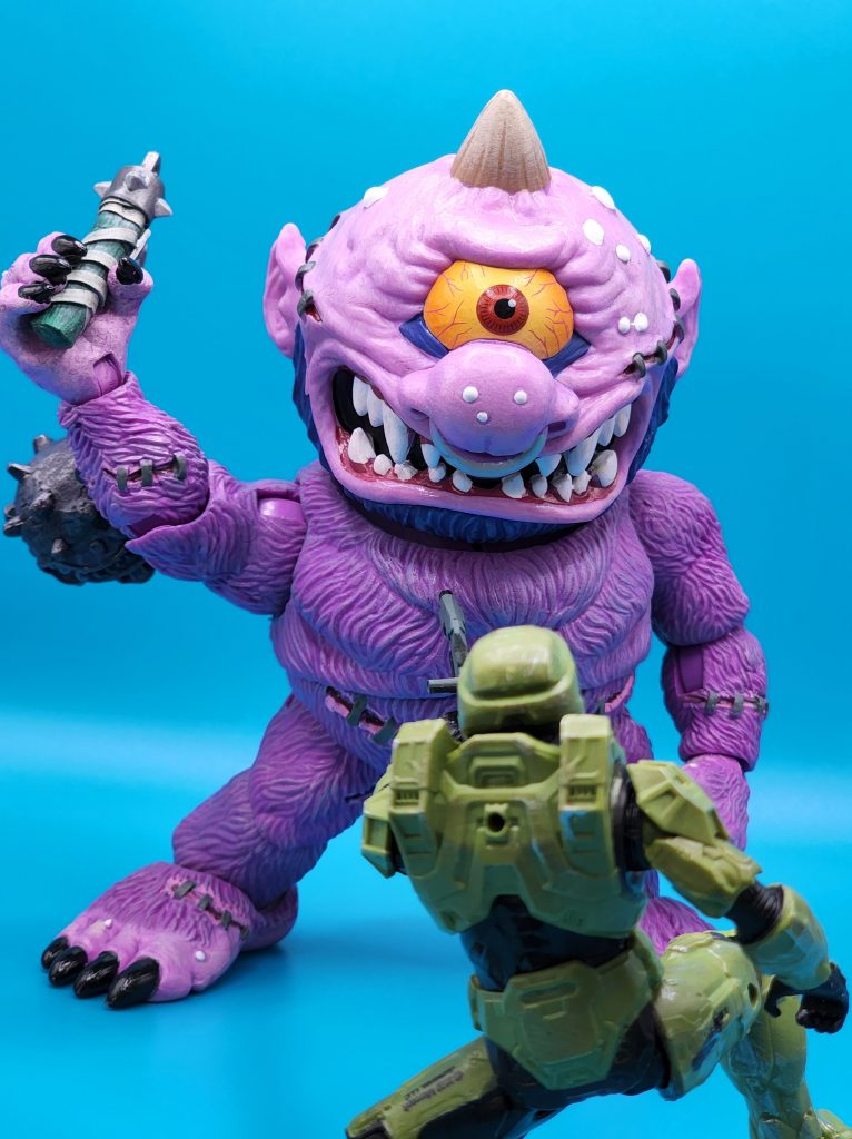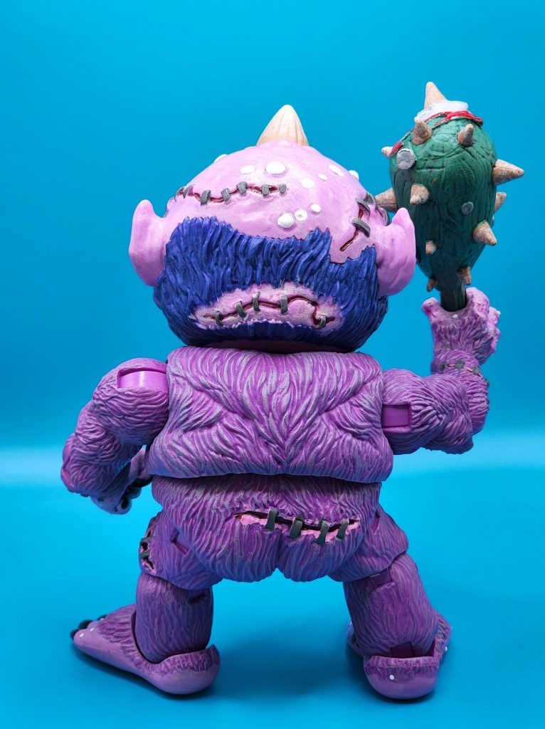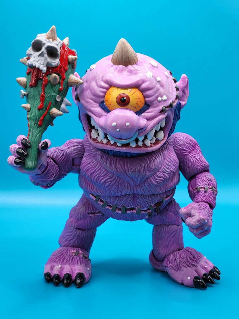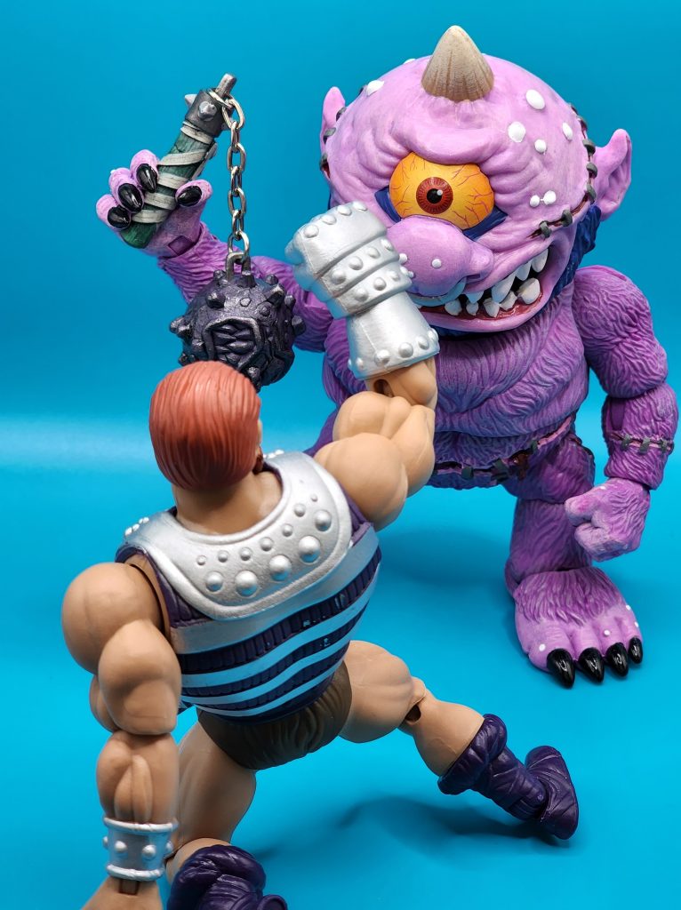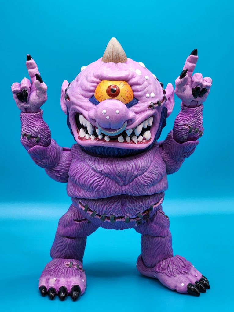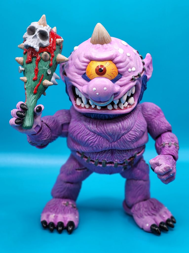 These six-inch figures are exceptionally well done- with 25 points of articulation and easy to snap off and interchangeable limbs with other Madballs figures (MADular technology, as it’s called); these are extremely well thought out, well-executed figures. Horn Head is quite the piece to behold in person: it has a solid weight, yet with joints that can hold the figure upright despite the girth. The figure comes with six extra hands and a turkey leg, club, and mace.