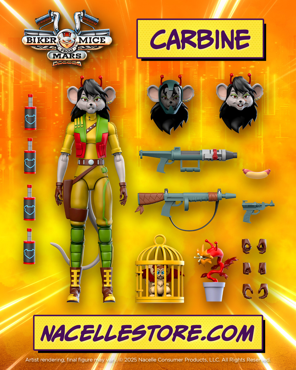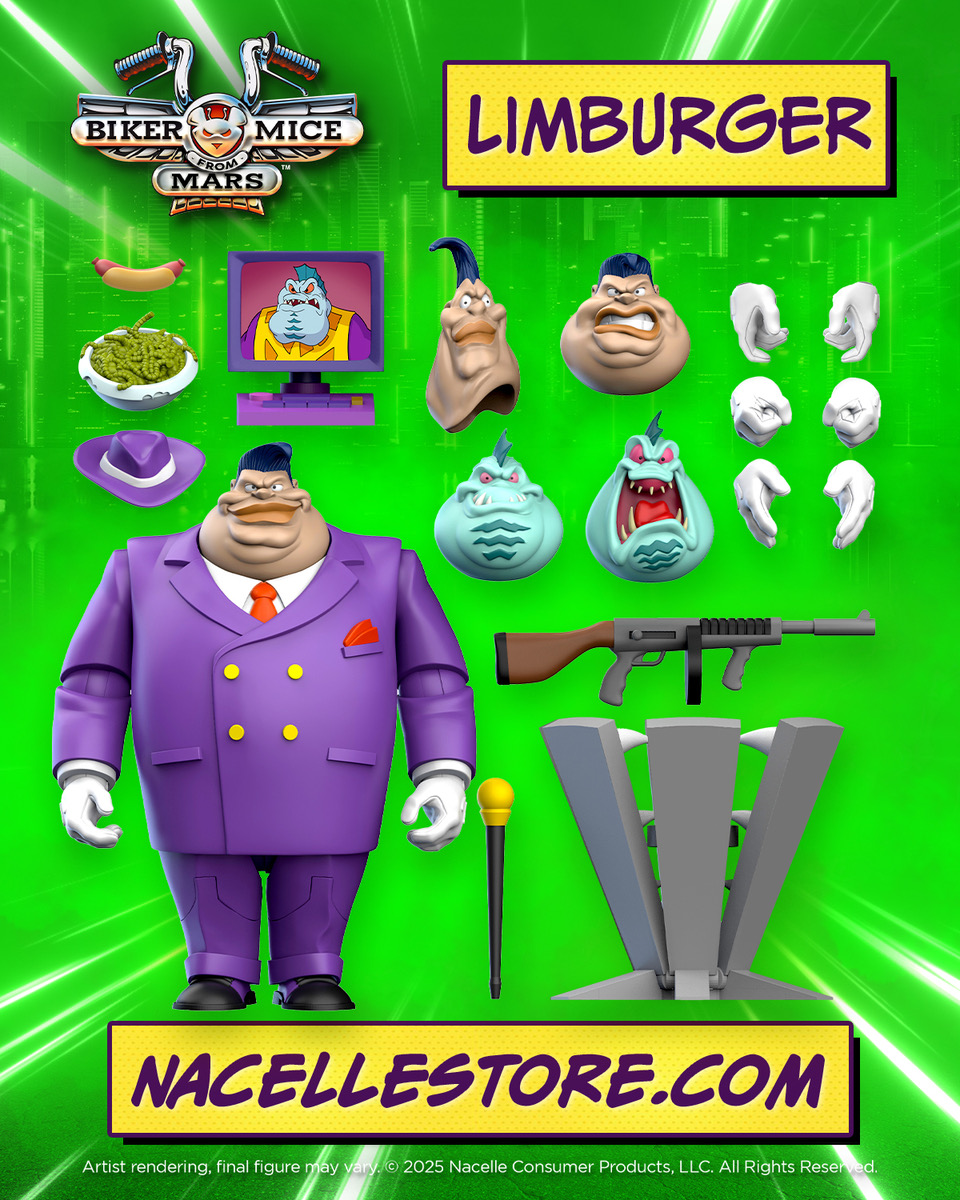 Nacelle, the company behind the NacelleVerse, an interconnected universe that includes Biker Mice from Mars, RoboForce, Sectaurs, Wild West C.O.W.-Boys of Moo Mesa, The Great Garloo, and Power Lords, is excited to announce a new wave of Biker Mice from Mars 1/12 scale action figures that include Lawrence Limburger, Charley, Carbine, Greasepit, Doctor Karbunkle and Fred the Mutant, along with a slew of unique accessories and interchangeable heads and hands.