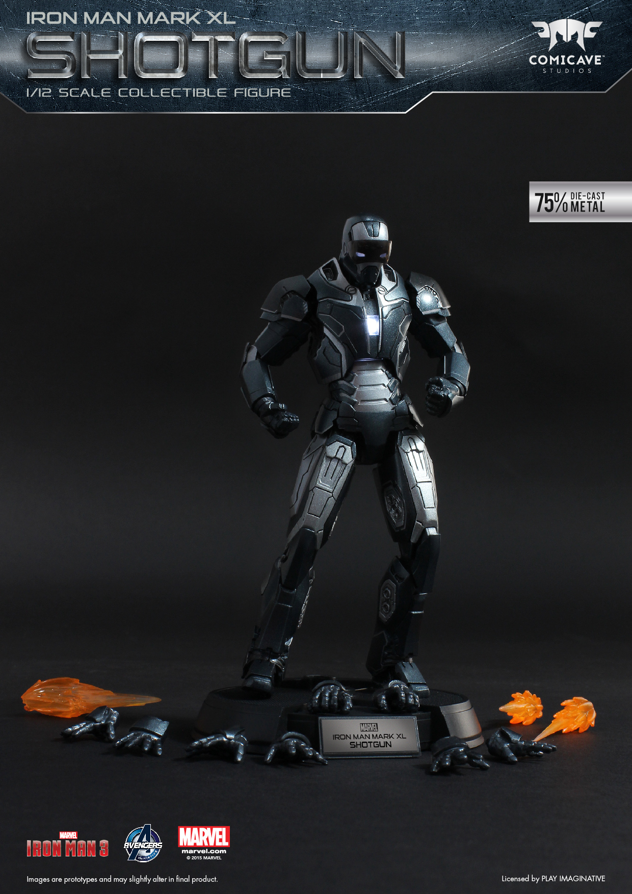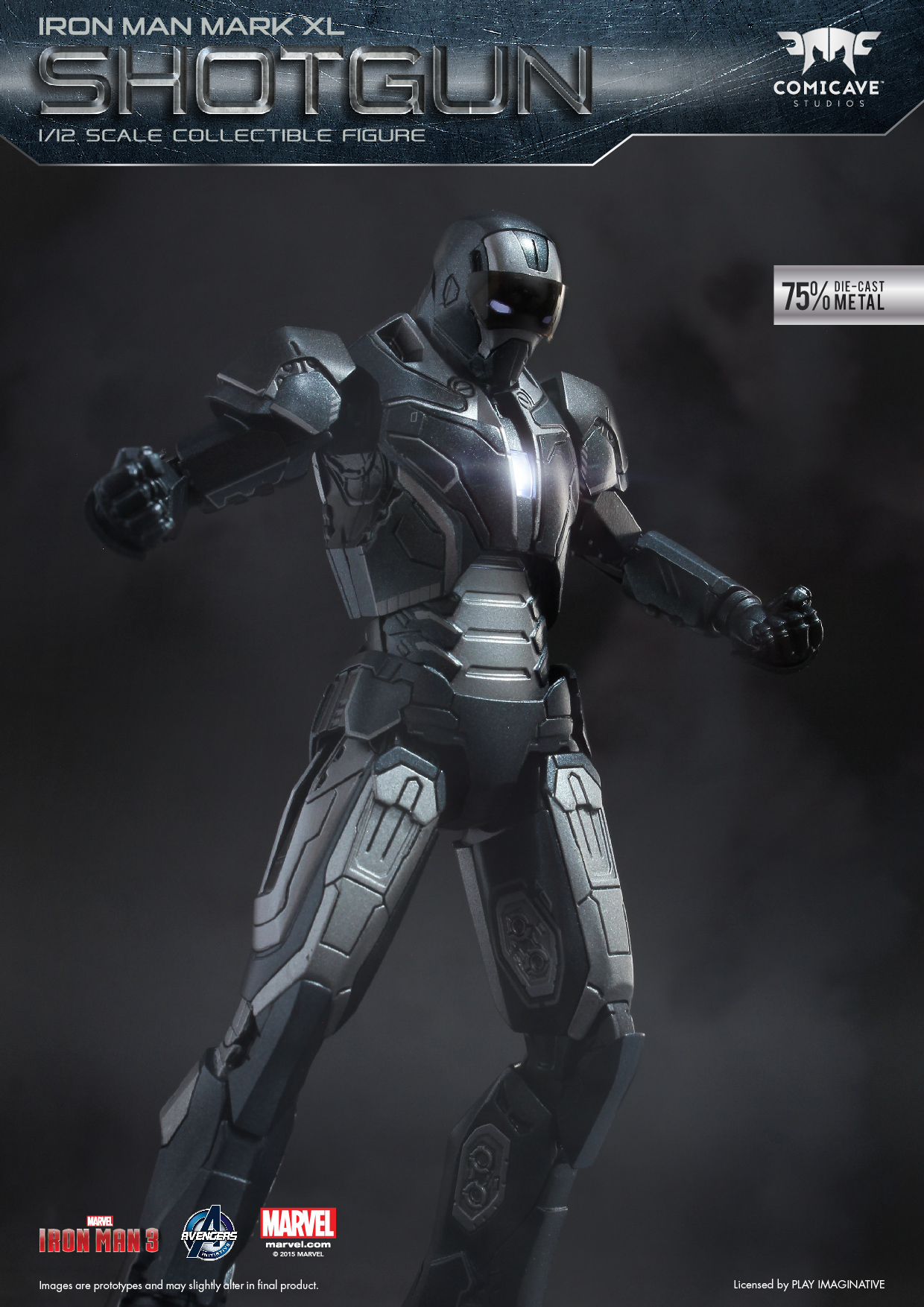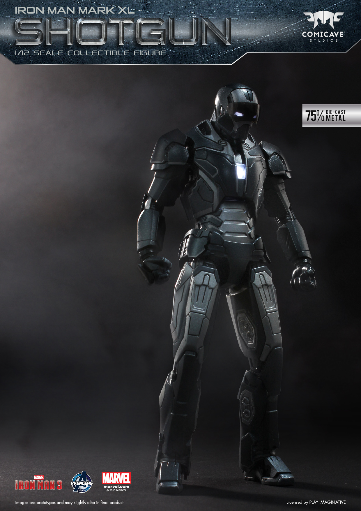 The Comicave Super Alloy 1/12 Scale Shotgun from Iron Man 3 is a fully articulated, 6 inch tall figurine with interchangeable accessories, and LED light features in the eyes and chest. A Hyper Velocity Traveling Suit, the Mark XL (40) is currently the fastest suit of the Iron Legion, and can reach speeds in excess of Mach 5. MSRP: $140.00
