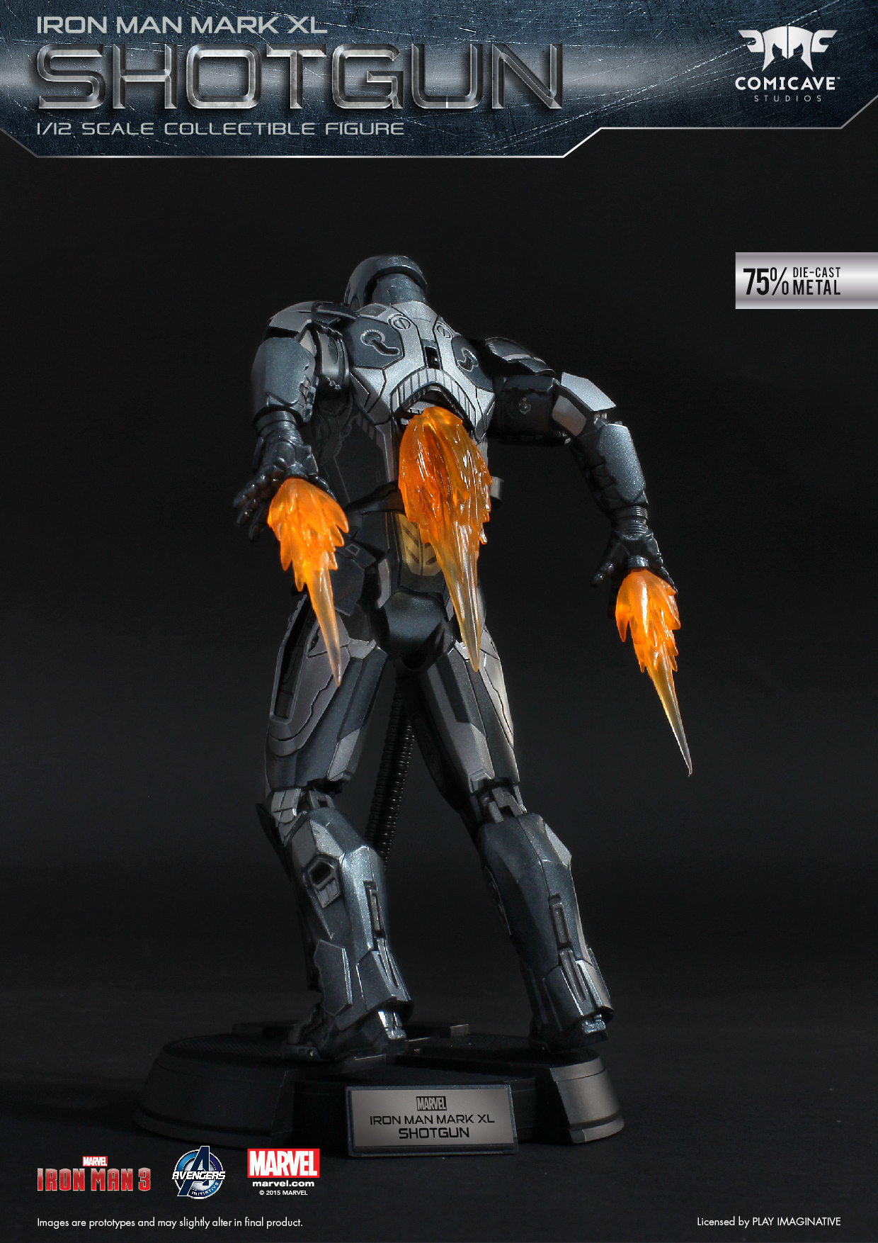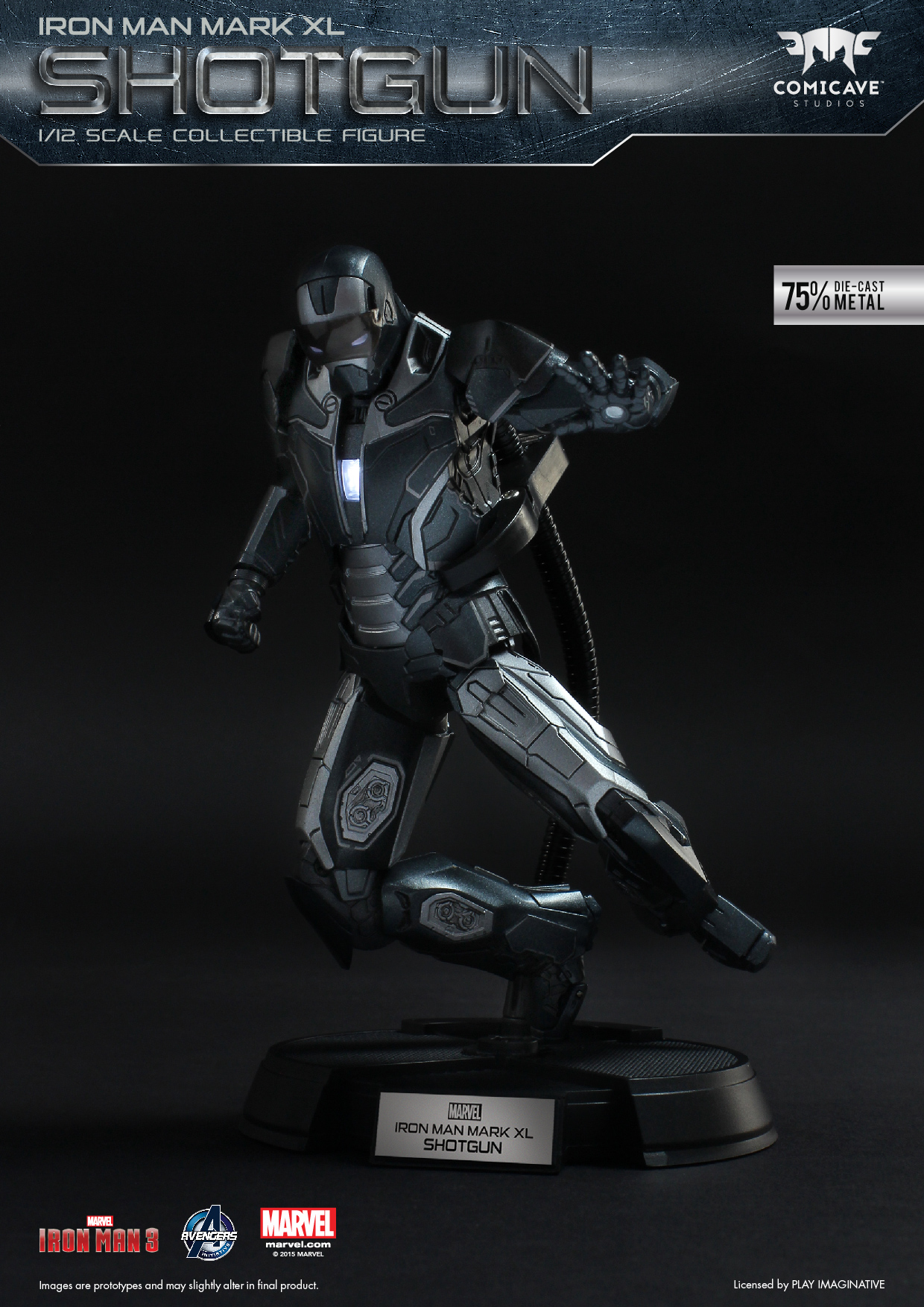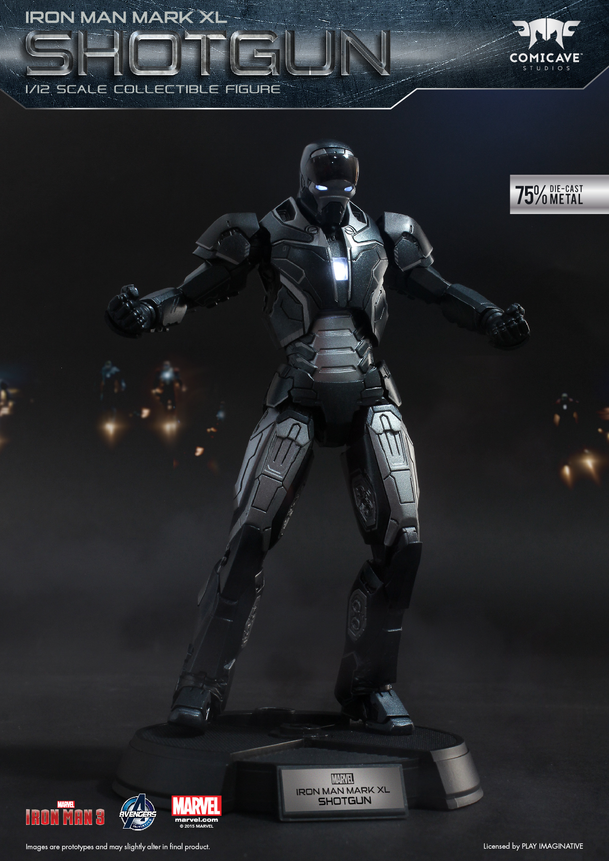 The Comicave Super Alloy 1/12 Scale Shotgun from Iron Man 3 is a fully articulated, 6 inch tall figurine with interchangeable accessories, and LED light features in the eyes and chest. A Hyper Velocity Traveling Suit, the Mark XL (40) is currently the fastest suit of the Iron Legion, and can reach speeds in excess of Mach 5. MSRP: $140.00