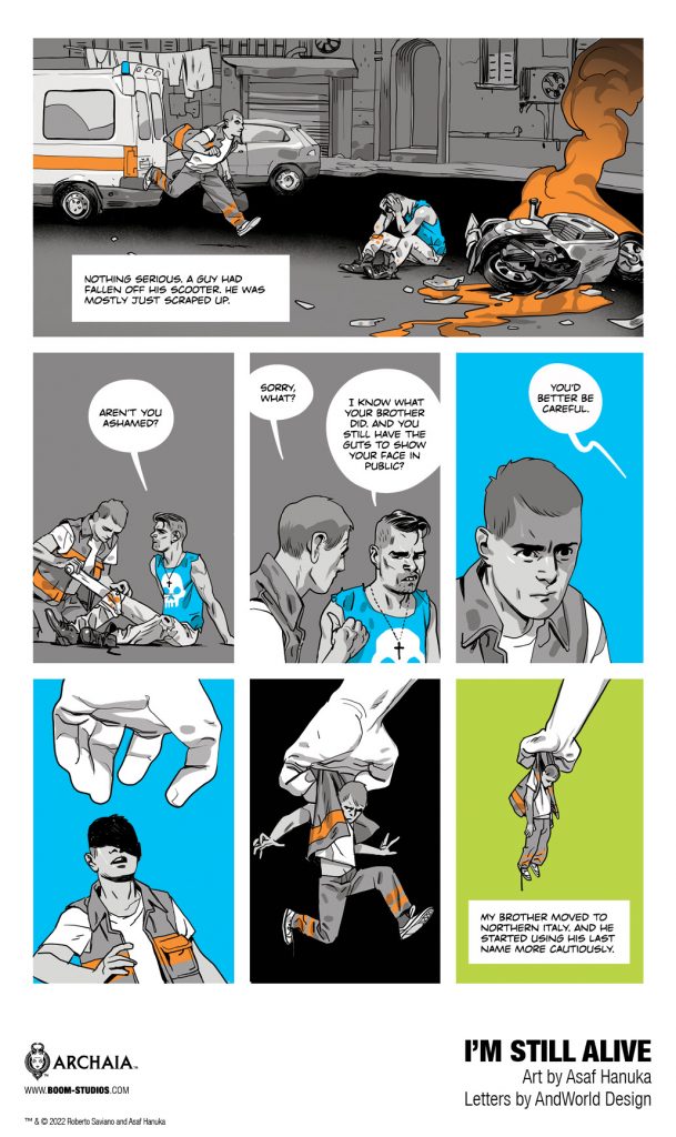 BOOM! Studios today revealed a first look at I’M STILL ALIVE, a new original graphic memoir from New York Times bestselling author Roberto Saviano (Gomorrah, ZeroZeroZero, The Piranhas) and Eisner Award-winning cartoonist Asaf Hanuka (The Realist, The Divine), detailing for the first time ever Saviano’s personal account of his 15 year-long existence as the Italian mafia’s greatest threat and his persistent will to survive, in stores October 2022.