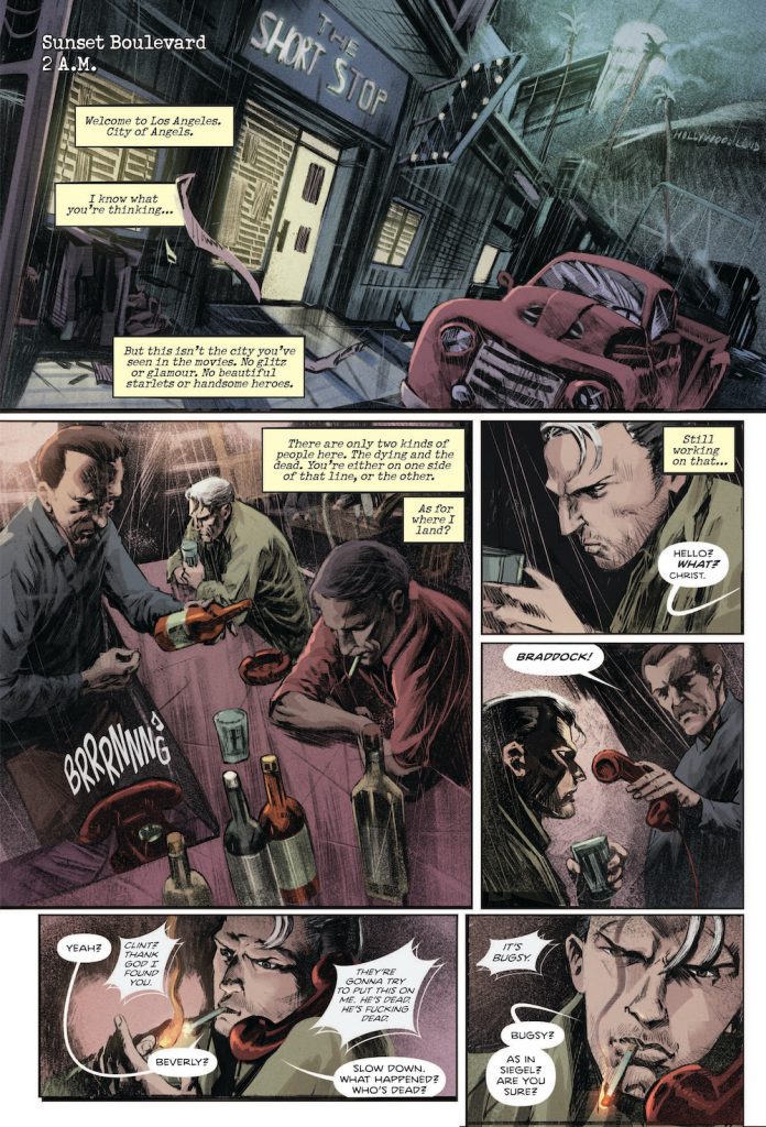 The 1940s were the hope and the beginning of a new era of American dominance on the world stage, but the “war years” have nothing on the allure and promise of Los Angeles. The all-new series, Blood on Sunset, written by visionary newcomer Mark D’Anna with art by Arjuna Susini (Made Men), colors by Vittorio Astone (Canto) and letters by Andworld, explores the darker side of Los Angeles tinged with the bloody undercurrent of organized crime…and then some.