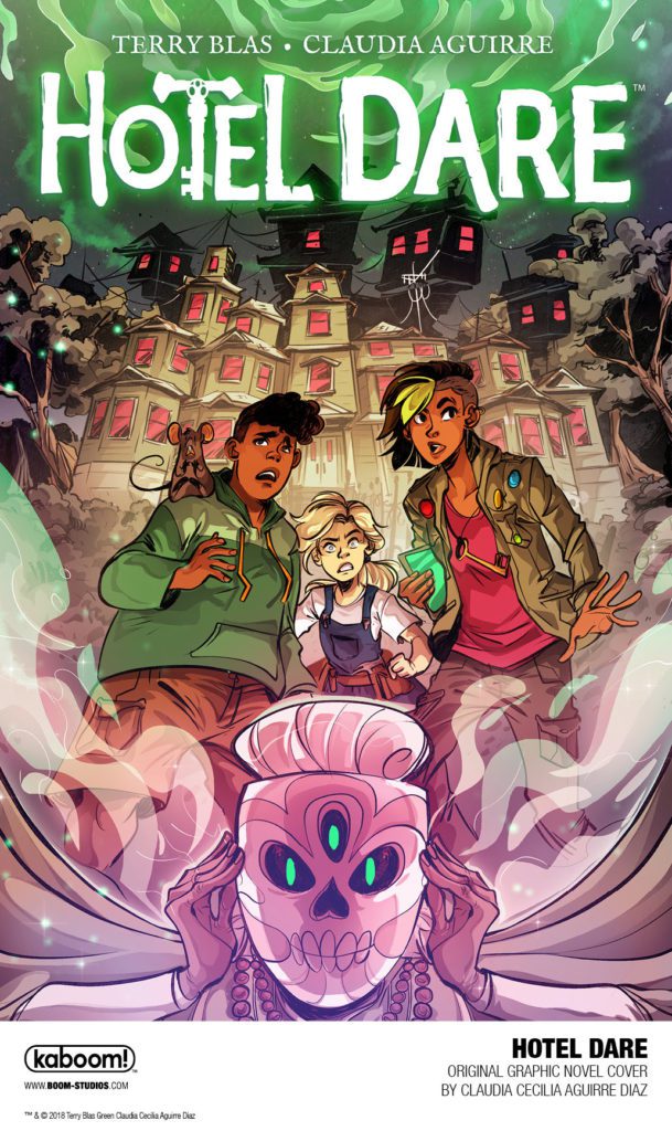 BOOM! Studios is proud to announce HOTEL DARE, an all-new original graphic novel (OGN) written by Terry Blas (Dead Weight) and illustrated by rising talent Claudia Aguirre (Kim&Kim). Arriving in stores April 2019, this world-hopping fantasy follows Olive and her adopted siblings, Darwin and Charlotte, as they spend their summer with their estranged grandma Mama Lupe at her creepy hotel in Mexico. When their boring chores lead them to discover a secret hiding behind every door of the hotel – thanks to a mysterious ancient mask — the kids are transported to three magical worlds filled with space Pirates, bearded Wizards, and cotton-candied kingdoms. But if they’re gonna save these three worlds from certain jeopardy, they’ll need to embrace the love and acceptance of family…before they tear themselves apart!