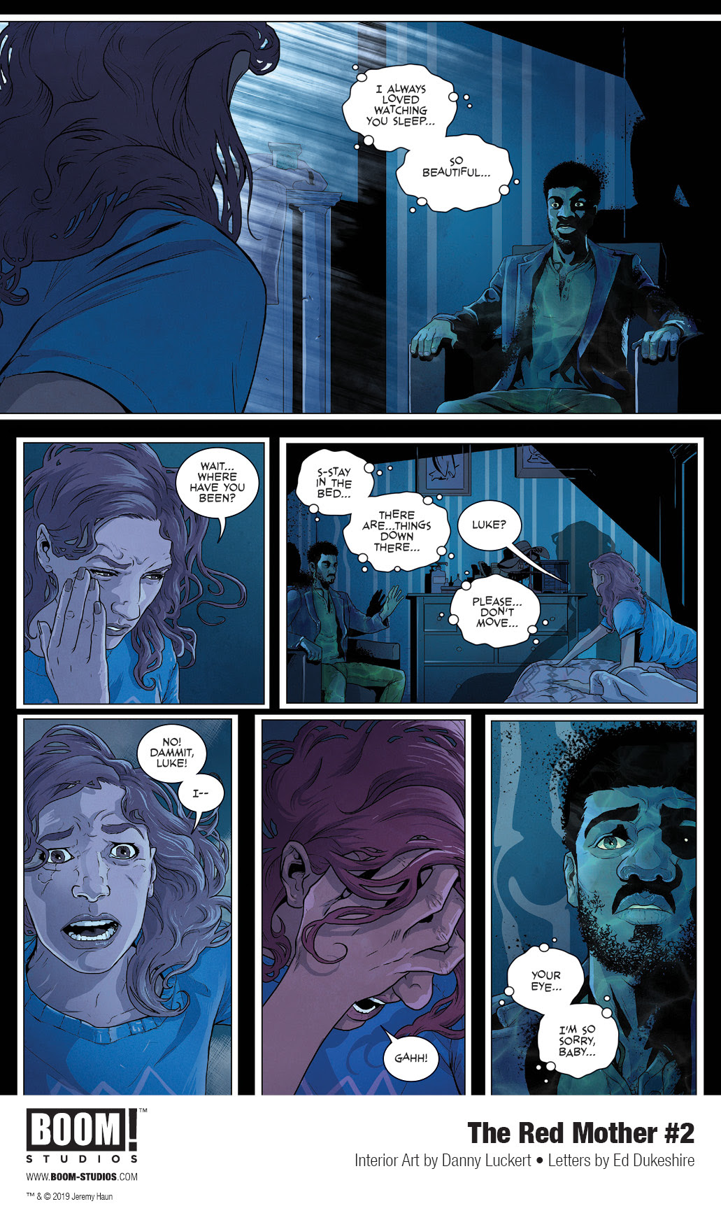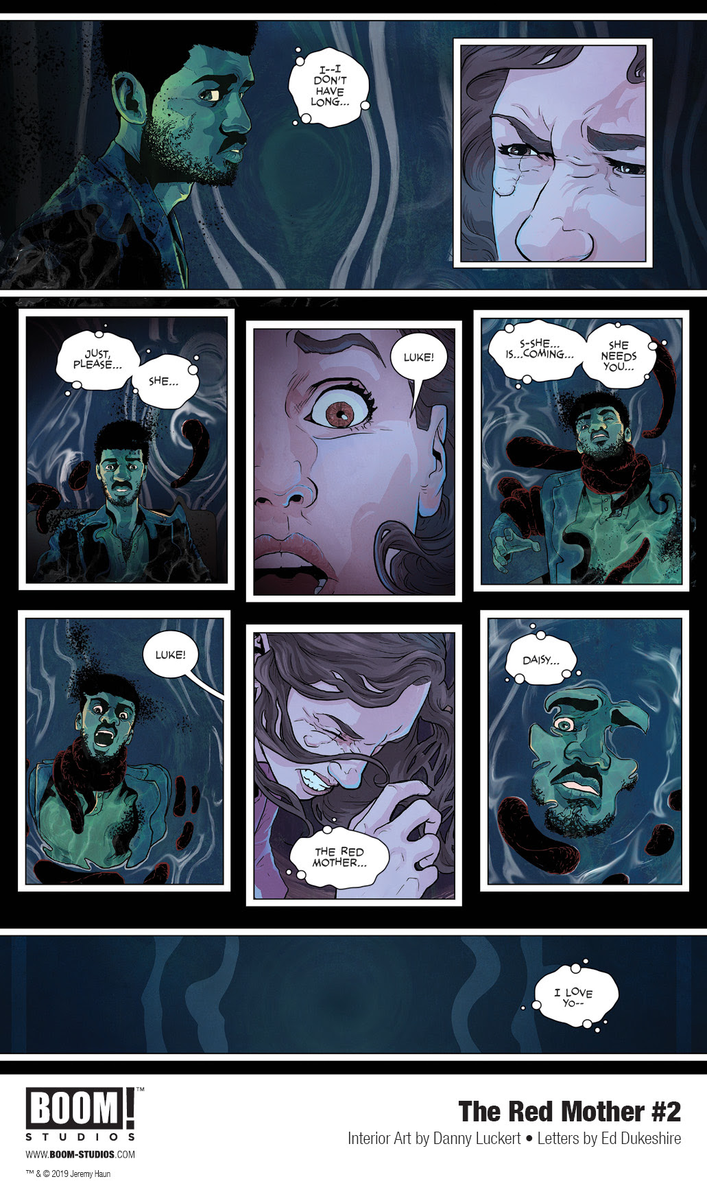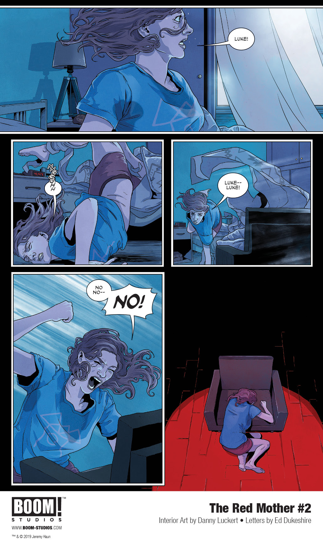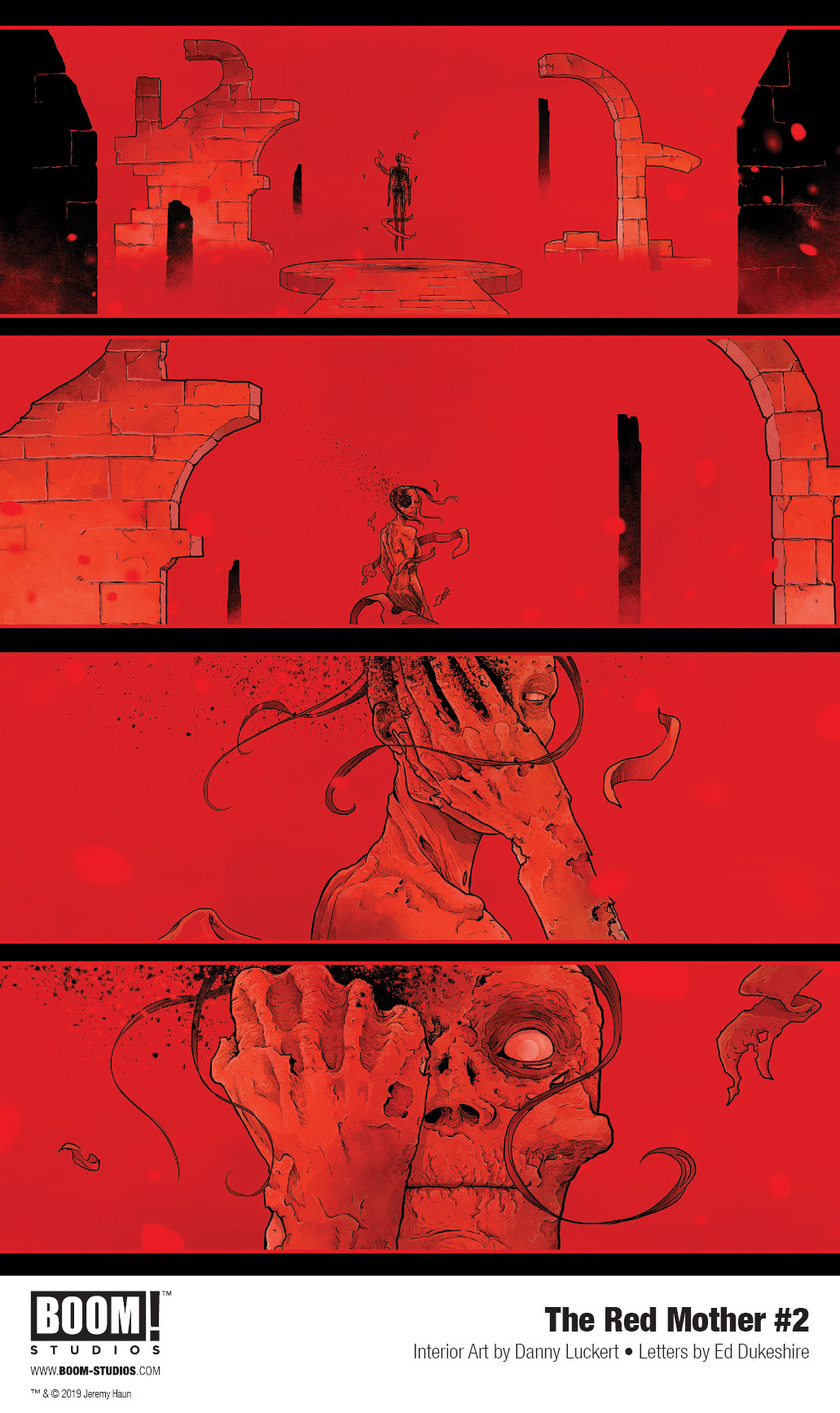 BOOM! Studios is proud to reveal a first look at THE RED MOTHER #2, the next issue of an all-new original comic book series from acclaimed writer Jeremy Haun (The Beauty, The Realm) and artist Danny Luckert (Regression) about a young woman who survives a tragedy, only to be afflicted with sudden, unexplained visions of horror and forced to deal with the terrible consequences.