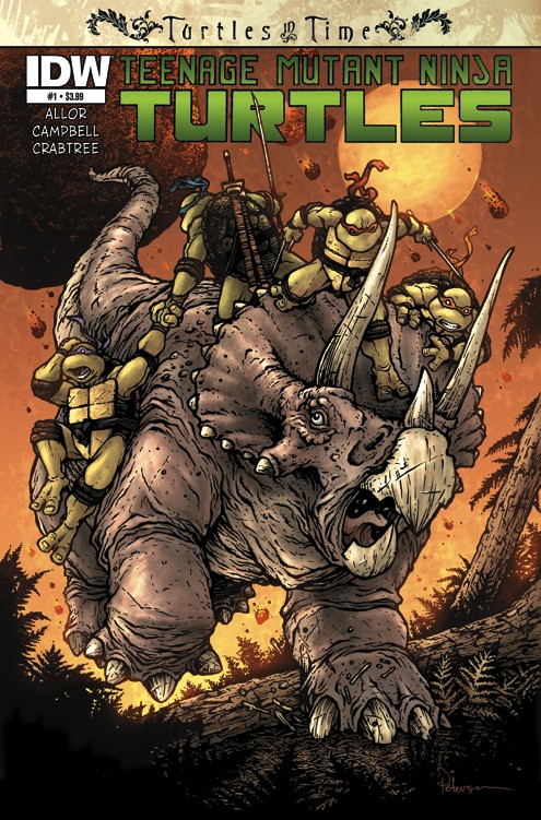 New from the good folks at IDW Publishing is a brand new Teenage Mutant Ninja Turtles mini-series titled “Turtles in Time”. Exactly where in time is pretty much given to us readers no matter which of the three different cover variants you choose, all featuring our half-shelled heroes in the clutches of some kind of dino. That alone was enough to lure me in.