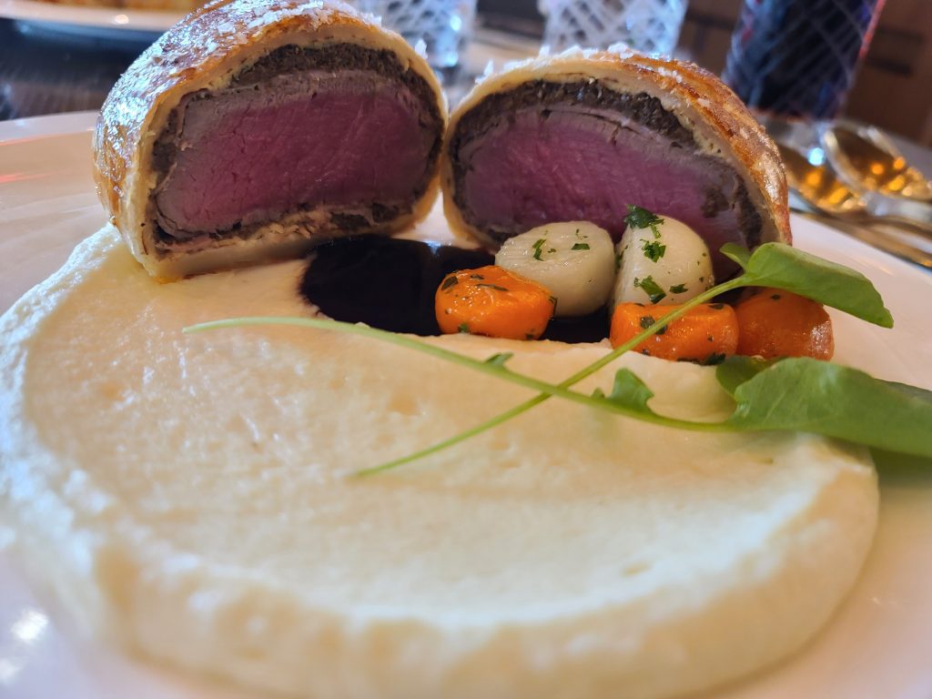 Next was the entree: beef wellington served with a potato puree, glazed root vegetables with a red wine demi-glace. The potatoes and vegetables were excellent, well prepared, and paired well with the entree, but let’s talk about the beef wellington. This was my first ever beef wellington, and it had to be at Hell’s Kitchen. The meat is cooked medium rare, which adds to the richness of the flavor. It is wrapped in a golden puff pastry, and when you take that first bite- you are in heaven- in Hell’s Kitchen. It was a pure joy taking that first bite, savoring the expertly cooked meat with the light crunch of the pastry. I looked at my girlfriend and saw her face as well: pure delight. It far exceeded all of my expectations and will go down as one of my favorite meals of all time.