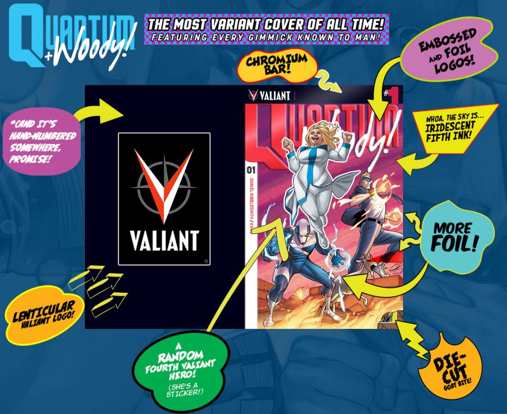 As first revealed at Comic Book Resources, Valiant sure seems proud of itself to announce THE MOST VARIANT COVER OF ALL TIME! – an unholy and experimental combination of comic book history’s most noted, notorious, and obnoxious cover gimmicks – chromium, lenticular, embossing, die-cutting, iridescent ink, and more – onto one highly limited, meticulously crafted edition of December’s QUANTUM AND WOODY! (2017) #1!
